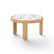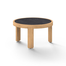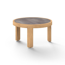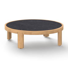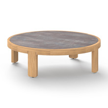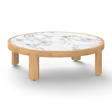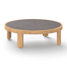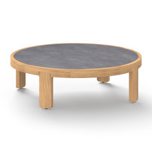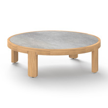 This elegant outdoor cocktail table has clean lines and upscale appeal. Its round frame and broad legs are made from high-grade plantation teak with a smooth finish. The warmth of the natural woodgrain contrasts with the ultra-cool look of the high-pressure laminate tabletop. HPL is sleek, durable, easy-to-clean and comes in a number of stylish marbled neutral tones. The table comes in two sizes to accommodate a variety of spaces.