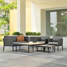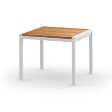 This elementary patio end table has a simple square aluminum frame in multiple powder-coated colors and a tabletop in recycled teak.