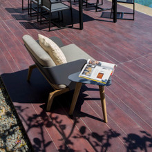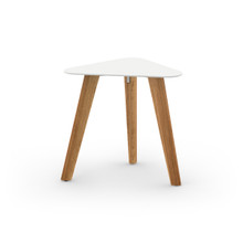 This simple patio side table has a three-legged teak base and a triangular aluminum tabletop in multiple colors.