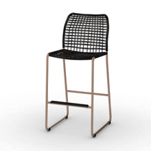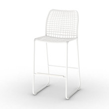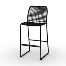 This flexible outdoor barstool has a basic metal frame that is available in powder-coated aluminum with four colors of synthetic wicker and an optional seat cushion.