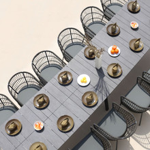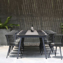 This impressive outdoor dining table has an ingenious design and high class look. Its sturdy galvanized steel frame and legs are powder-coated in black, white and chapagne. This protective finish prevents corrosion and water damage. The table also comes in stainless steel with a sleek hairline finish. The sleek tabletop is made from Italian high-pressure laminate in seven neutral colors.