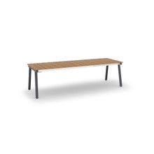 This imposing patio dining table has epic proportions and a clever design. Its oversized frame and splayed legs are made from powder-coated galvanized steel with a variety of ultra durable finishes. The colorfast coating protects the metal from corrosion and the elements. Rustic reclaimed teak or smooth-sanded plantation teak is used to create the slatted wooden tabletop and extension leaves housed within the table itself.