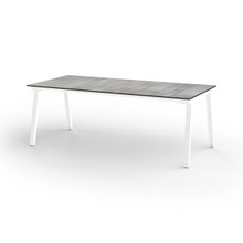 This gorgeous outdoor dining table has a streamlined contemporary design and understated elegance. Its strong base has flared legs and is made of either galvanized or 304 stainless steel. The former is powder-coated in your choice of gloss or ultra-durable semi-gloss finishes in a number of neutral shades, while the latter has a brilliant hairline look. Powder-coating protects the metal against corrosion and other damage typically experienced due to extended exposure to the elements.