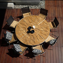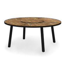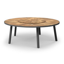 This chic round patio dining table has a stainless steel frame in a variety of finishes. It has a laminated recycled teak top in two sizes with a random pattern and features a rotating center tray. An HPL version of the table is also available.