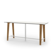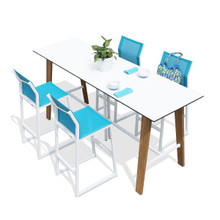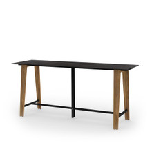 This welcoming outdoor bar height table has a Japanese-inspired design and tranquil feel. Its tapered legs and frame are crafted out of reclaimed teak from Indonesia. This eco-friendly hardwood has a unique character, rustic finish and protective wood sealant shield. The framework is reinforced by a galvanized steel support structure and topped by high-quality high-pressure laminate from Italy. HPL is chip-resistant, easy to clean and maintain and comes in seven chic neutral shades.