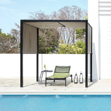 This hospitality-grade canopy is perfect for high-end resorts and hotels, or upscale residential installations. However, it's not intended for high wind settings, beachfront properties or rooftop decks. It needs to be secured by mounting to the surface of concrete, stone or decking. Alternatively, it can be secured in poured concrete. This model is great for a couple of lounge chairs and an end table.