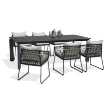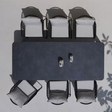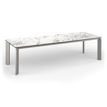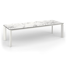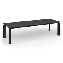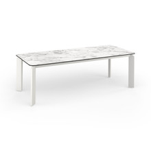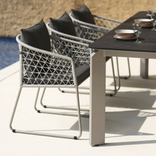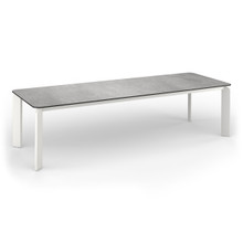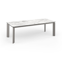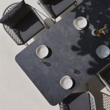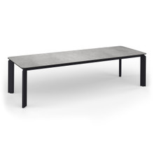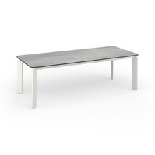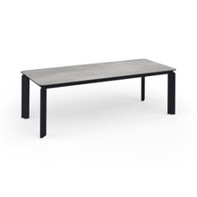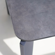 This majestic outdoor dining table has a chic contemporary design with an epic vibe. Its wide angled legs and frame are made of powder-coated aluminum in one of seven neutral shades. The matte and semi-gloss finishes inure the metal against rusting and other damage from extended exposure to the elements.
