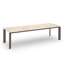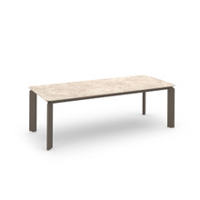 This striking outdoor dining table brings a refined, contemporary presence to any patio or terrace. Its bold, wide-angled legs and frame are crafted from powder-coated aluminum, offered in seven versatile neutral tones. The advanced finish helps protect against rust, corrosion, and everyday wear—so it won’t flinch when left out in the elements.