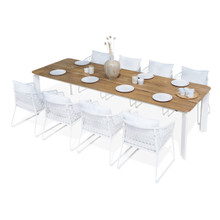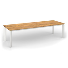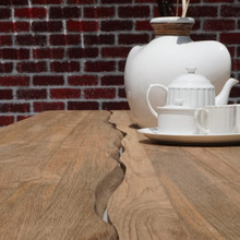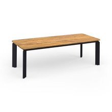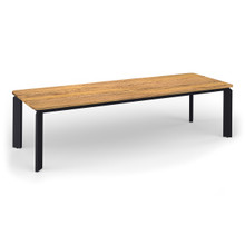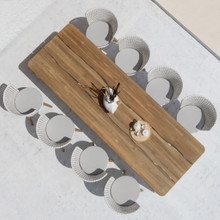 This spectacular outdoor dining table has a gorgeous contemporary design and natural appeal. Its signature rectangular wooden tabletop is made from recycled teak with a brushed texture. The eco-friendly wood has a manmade life edge that gives it an organic look that helps create a welcoming ambiance for meals.