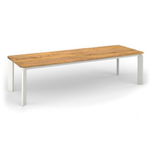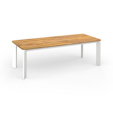 Its strong aluminum frame has angled legs and a stylish feel that complements the rounded corners and warm woodgrain of the top. The metal is protected against corrosion and weather-damage by a powder-coating in either matte or ultra-durable semi-gloss finishes in a variety of neutral shades.