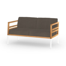 The reclined back of the frame provides extra visual appeal, as it nestles robust Sunbrella cushions within its confines. The upholstery is weather and fade-resistant and comes in multiple fabric options. The simple base is made from powder-coated aluminum in multiple neutral matte and ultra-durable semi-gloss finishes. Mix and match this high end outdoor sofa with a few Zudu lounge chairs to create an inviting space in which to entertain friends and family.