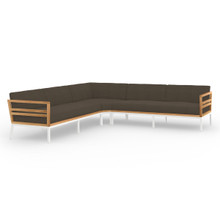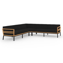 This massive corner sectional balances comfort with an enduring style that bridges time and geography. Its signature upper frame is crafted from the finest recycled teak to resemble a traditional Japanese shoji panel without the diaphanous white paper. The minimalist look is augmented by a gently sloping back support, which creates a visual serenity that complements natural environments. It has an unobtrusive metal base of lightweight aluminum powder-coated in either matte or ultra-durable semi-gloss neutral tones.