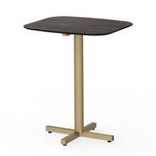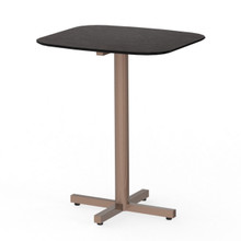 This handy cafe table has a simple aluminum or galvanized steel base that is powder-coated in one of a variety of neutral and metallic finishes with a square high pressure laminate top in a number of classic hues and two sizes.