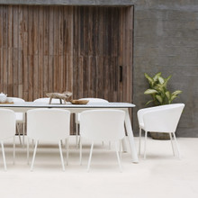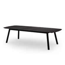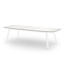 This helpful expanding dining table has powder-coated aluminum legs in multiple neutral colors with a high-pressure laminated top in two sizes and multiple neutral tones.