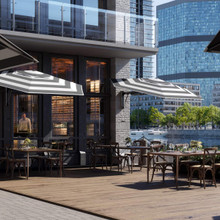 Outdoor umbrellas typically require a lot of clearance to accommodate opening and closing. They also take up a fair amount of floorspace (especially cantilever models). That's not a big deal if you have a spacious backyard deck or wide open patio but smaller settings don't have that luxury. Most balconies, porches and undersized urban spaces just can't handle large in-ground or freestanding shade installations.