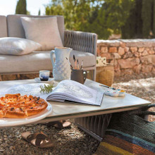 Wide Sunbrella® seat and back cushions provide plush comfort and ample room. The solution-dyed acrylic fabric is fade and tear-resistant and repels water. It comes in two standard colors: natte white and grey chine, but custom colors are available upon request.