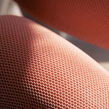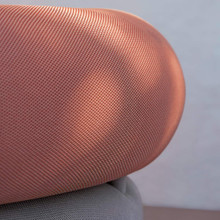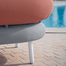 This eye-catching outdoor lounge chair has a bold modern design and friendly feel. Its over-stuffed seat and wrap-around back upholstery is reminiscent of inner tubes used as floatation devices in swimming pools. The cushions are wrapped in thick yet flexible braided 3D polyester in light grey and salmon colors. This weather-resistant textile is durable and brings a visual pop with its two-tone palette.