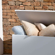 This handy outdoor bin has a simple rectangular design and hinged lid. Its body is made from sturdy aluminum with a woven polyester covering. This PVC-coated synthetic material is fast-drying and is available in grey, taupe and white colors. The storage chest is perfect for keeping accent pillows, throws and miscellaneous outdoor items out of sight and protected when not in use.