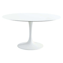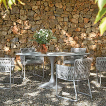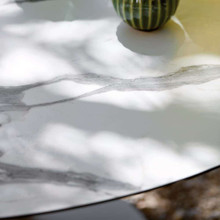 This iconic outdoor dining table has a distinct Mid-Century Modern design and debonair style. Its graceful lines are clearly inspired by Eero Saarinen and his timeless Tulip Table. The flowing cast aluminum base has a laquered matte finish in grey, white or mocha and is resistant to weather damage. The long oval tabletop is fabricated from a durable high pressure laminate that is scratch-resistant and perfect for outdoor use or tempered glass. This HPL has the look of white marble which adds to the upscale appeal of the table. Gather a few Basket dining chairs or Oskar director chairs around this stylish oblong table to create an elegant al fresco dining experience.