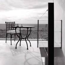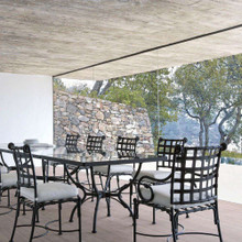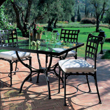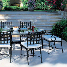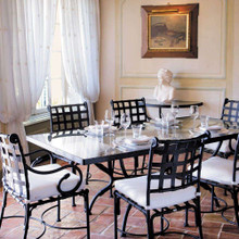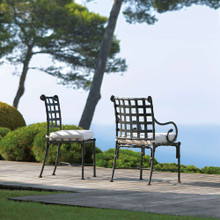 This stylish traditional metal dining chair has a black finish, white Sunbrella cushion and is part of the Kross collection from Sifas. An optional matching back cushion is available.