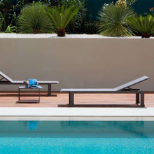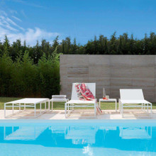 This contemporary outdoor side table has minimalist lines and maximum utility. Its chromed aluminum tube frame has a simple square design and is available in either mocha or white finishes. The durable tempered glass tabletop is chemically sandblasted to prevent fingerprints. This high end accent table complements the other furniture pieces in the Kwadra collection.