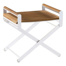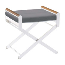 This versatile contemporary ottoman is dynamic and attractive - great qualities to possess when your leisure furniture needs to be able to accommodate different entertainment events in multiple locations. Its folding white aluminum lacquered frame is sand-blasted and anodized for durability, while Synteak® handles make it easy to move and provide a handsome accent. The white seat is woven from PVC-coated Textilene® polyester, which gives it strength and weather protection from the harshest elements. If you're looking for a little more comfort, you can add a beautiful cushion that's covered in fade-resistant Sunbrella® fabric in four colors. Do you need a side table? This convenient piece of furniture easily converts into a stylish accent table with the addition of a removable Synteak® tabletop. Mix and match this ottoman with other lounge furniture in the Oskar line to create multiple configurations for your screened in porch, deck or poolside entertainment needs.