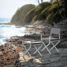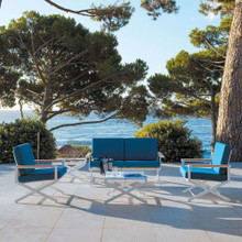 This multi-purpose modern ottoman has a folding matte white aluminum frame, white woven support, thick cushion in various Sunbrella colors and is part of the Oskar collection from Sifas.