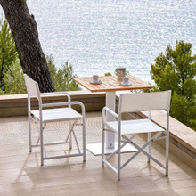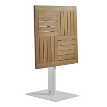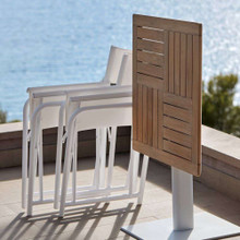 This convenient folding bistro table has a lacquered aluminum base and stem in four chic neutral tones with an inclining top in synthetic teak or ceramic in one of three faux stone looks.