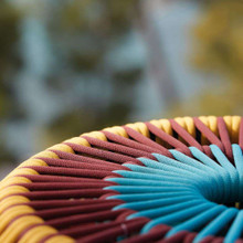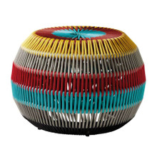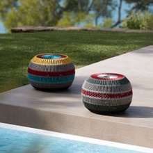 This colorful outdoor pouf has bold look and comfortable vibe. Its bulbous design features striped braided polyester fibers in a classic khaki and red combo or one with a wide variety of vibrant colors and neutral tones.