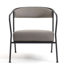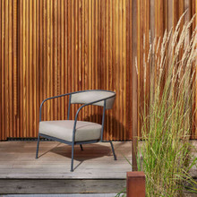 This attractive outdoor lounge chair has a modern design and is built to last. Its wide but thin aluminum frame is powder-coated in dark grey. The finish protects the metal from corrosion and is fade-resistant. Its rounded arms flow to its gently curving upholstered backrest. The seat cushion and back padding are covered in durable Agora Panama fabric in a complementary lighter grey color. The synthetic textile is colorfast and resists tearing and water.