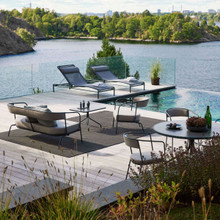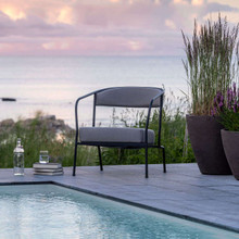 This trim outdoor lounge chair has a slender dark grey aluminum frame with plush light grey Agora Fossil seat and back cushions.
