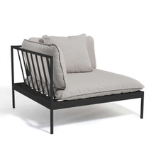 This svelte patio corner seat has a clever modular design and comforting appeal. Its slender square frame is made of lightweight yet strong aluminum with a powder-coating in dark or light grey. The electrostatic finish protects the metal from rust and weather damage. The angled back support staves give the chair additional depth and style.