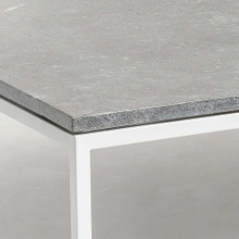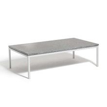 This sleek outdoor lounge table has a minimalist modern design and ubiquitous appeal. Its slender framework is made of powder-coated aluminum in light or dark grey. The protective finish strengthens the metal against corrosion and other environmental damage.