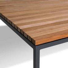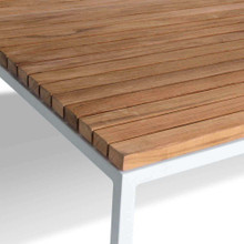 It comes in a small square and a larger rectangular version. The tabletop is available in your choice of teak slats or mineral composite in coordinating grey colors. The hardwood has a lovely warm coloration that will fade to an elegant silver grey.