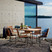 This practically designed dining side chair utilizes teak slats and a black painted steel frame. It may be no nonsense, but the Grinda casual dining collection has a certain flair that accentuates a variety of styles, whether you decide to decorate your balcony, veranda or deck. The side chair coordinates with an arm chair and four different sized outdoor tables.