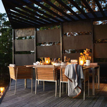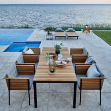 This sophisticated patio armchair has a box-like teak slat body with a natural woodgrain finish, a black steel frame and grey Agora® Fossil seat cushion.