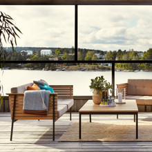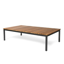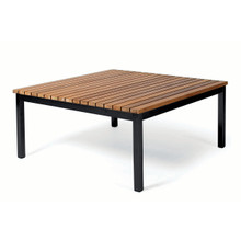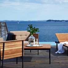 This suave patio lounge table has classic lines and a ubiquitous style that complements any outdoor setting. Its durable stainless steel legs are available in a powder-coated black finish. The tabletop is made up of warm honey-colored teak slats with a natural woodgrain finish. This eco-friendly hardwood will patina, if left untreated, to an elegant silver grey. The Haringe Lounge Table comes in two sizes and coordinates with the sofa, lounge chair and sunlunger in the collection.