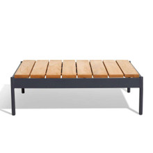 This good-looking patio coffee table has a low-profile design and contemporary appeal. Its square dark grey aluminum frame is topped with wide slats of eco-friendly teak wood that creates a broad surface for placing drinks, snacks or games. The natural oils of the teak help to keep it strong for decades and the golden finish will transition to a beautiful silver grey over time.