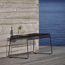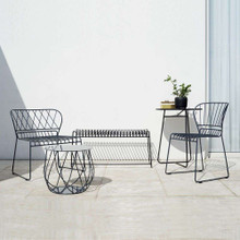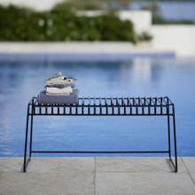This stylish outdoor bench has an interesting steel wireframe body that is powder-coated in three classic neutrals and comes with an optional seat cushion that is wrapped in premium Grey Agora Fossil fabric.