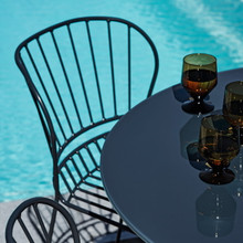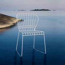 This Scandinavian steel wireframe dining chair has a powder-coated finish in charcoal grey with an optional seat cushion covered in all-weather Grey Agora Fossil fabric.