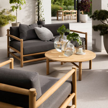 This friendly patio coffee table has a strong teak dowel structure with a round slatted tabletop.