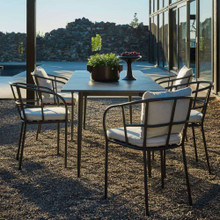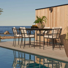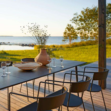 This striking outdoor dining table has a minimalist Swedish design and sleek upscale look. Its low profile tabletop and slender legs are made of powder-coated aluminum in charcoal grey. The finish protects the metal from weather damage and makes it easy to clean and maintain.
