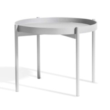 This intriguing patio table has a spare utilitarian design that still retains aesthetic appeal. It round tray-style tabletop and thin legs are made of powder-coated aluminum with a light or charcoal grey finish. The coating protects the metal from rust and other issues due to exposure to the elements.