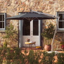 This versatile offset patio umbrella has a contemporary design and a variety of valuable features. Its durable aluminum frame rotates a full 360° and the canopy tilts from side to side - enabling this ingenious cantilever umbrella to track with the sun and provide optimal shade throughout the day. The crank lift makes opening and closing the canopy effortless, while the quick-release system allows the canopy fabric to be easily removed for cleaning, maintenance or off-season storage.